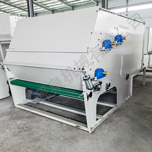 把各種捆包纖維、原料經(jīng)電子稱重后,喂入平簾輸送至主體混倉(cāng)內(nèi),再由三道開(kāi)松輥高速開(kāi)松混合后,經(jīng)輸棉風(fēng)機(jī)以適量的風(fēng)量輸送纖維原料供后道工作使用。經(jīng)本機(jī)開(kāi)松混合后的纖維、原料效果好,混合均勻,以備梳理使用。